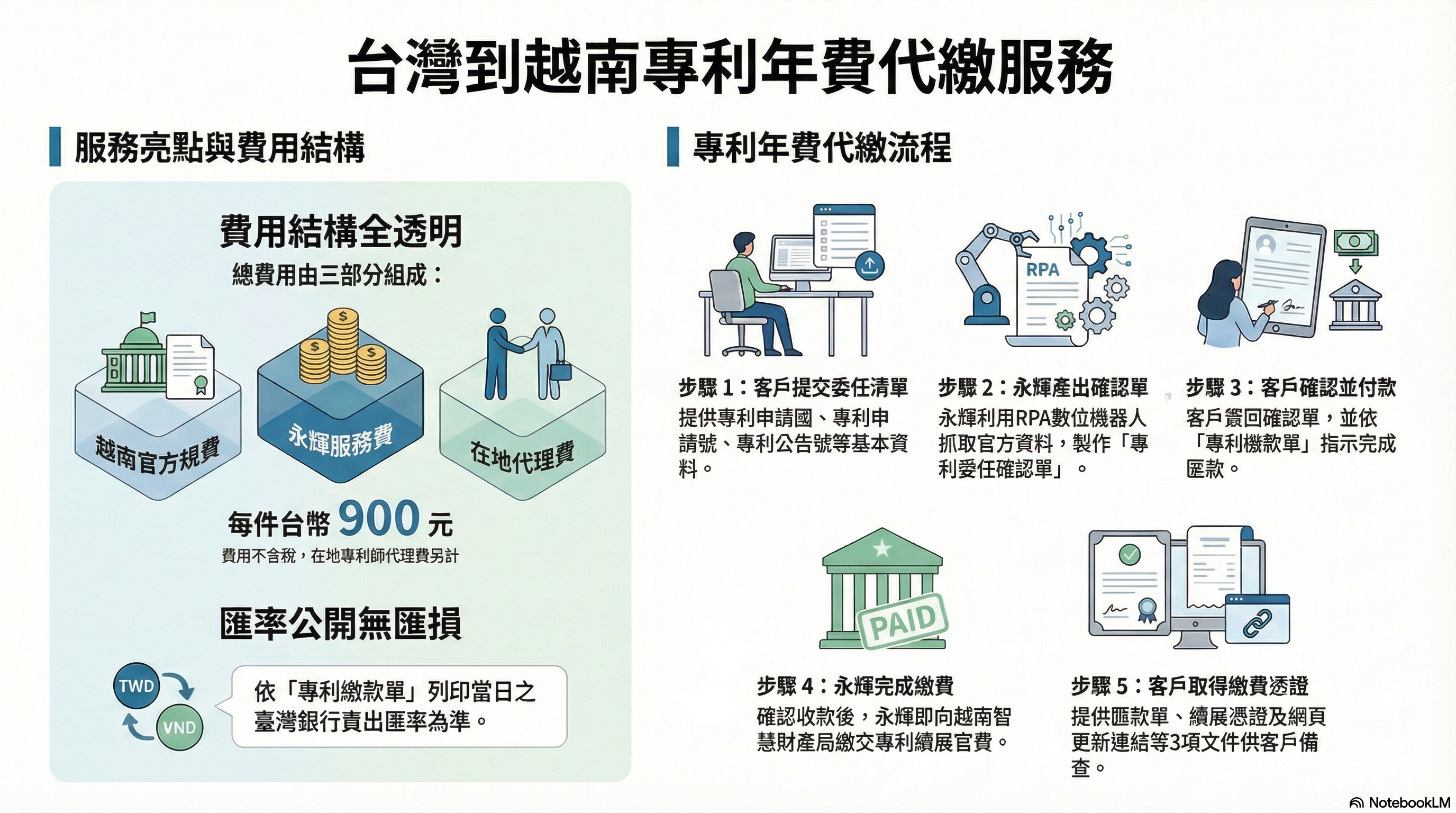 永輝團隊會用RPA數位機器人去越南的智慧財產局取得專利相關資料,並產生”專利委任確認單”列出越南越南盾的官費,加上永輝服務費,和在地專利師代理費。